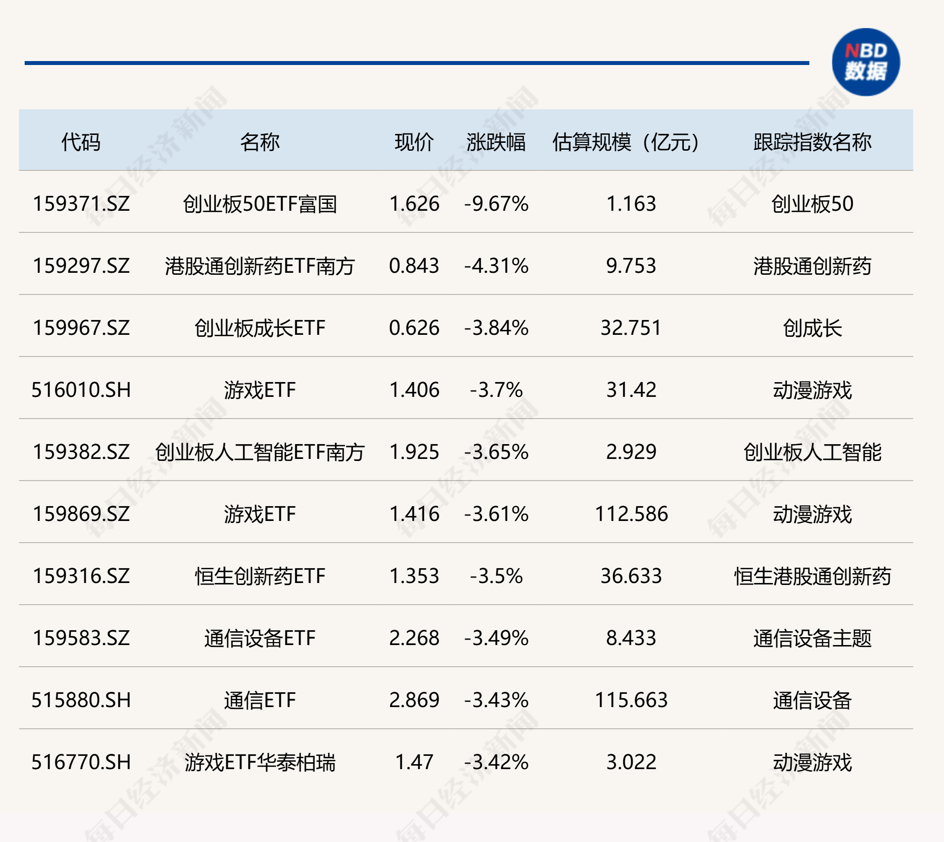 下跌方面,创业板50ETF富国跌超9%,游戏ETF跌超3%。