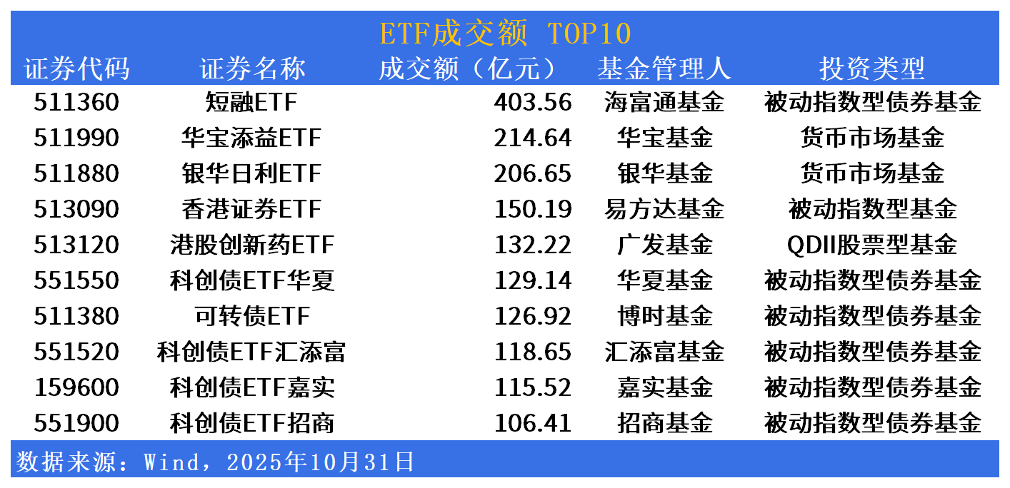 成交额方面,短融ETF(511360)今日成交额居首,达403亿元;华宝添益ETF(511990)、银华日利ETF(511880)、香港证券ETF(513090)成交额紧随其后。