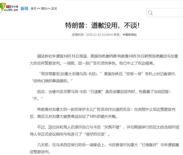 无奈之下,加拿大总理卡尼一边紧急与安大略省长切割,宣布 10 月 27 日起停播广告,一边主动示好道歉,直言 “随时准备重启谈判”。