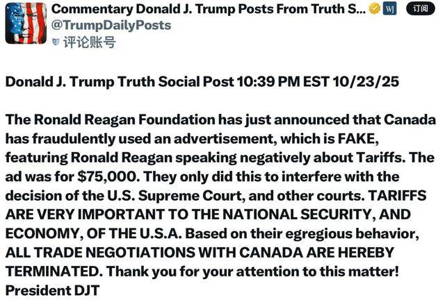 10 月 23 日深夜,他在社交平台连发数条推文,怒斥加拿大 “伪造讲话”“干扰美国司法”,二话不说就宣布终止所有贸易谈判。