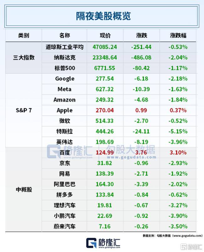 大型科技股多数下跌,英特尔跌超6%,特斯拉跌超5%,英伟达跌超3%,谷歌跌逾2%,亚马逊、Meta跌超1%,微软涨0.52%,苹果微涨0.37%。