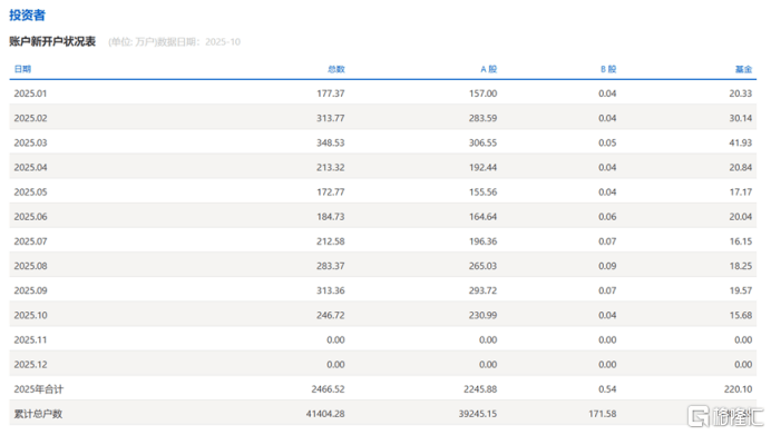 2025年10月A股新开户231万户,同比去年10月的685万户下降66%,环比9月下降21%,主要受假期和股市震荡影响;前10个月已累计新开2246万户,同比增长11%。此前开户数在3月突破300万户,4月因关税摩擦环比大降,6月起持续回升态势在10月中断。