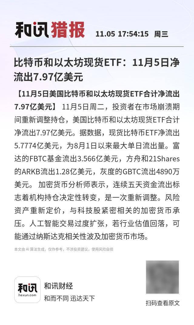 【11月5日美国比特币和以太坊现货ETF合计净流出7.97亿美元】11月5日周二,投资者在市场崩溃期间重新调整持仓,美国比特币和以太坊现货ETF合计净流出7.97亿美元。据数据,现货比特币ETF净流出5.7774亿美元,为8月1日以来最大单日流出量。富达的FBTC基金流出3.566亿美元,方舟和21Shares的ARKB流出1.28亿美元,灰度的GBTC流出4890万美元。 加密货币分析师表示,连续五天资金流出标志着机构持仓决定性转变,是一次重新调整。风险资产重新定价,与科技股紧密相关的加密货币承压。人工智能交易过度扩张,若行业估值回落,可能通过纳斯达克相关性波及加密货币市场。