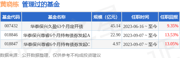 证券之星消息,2025年11月6日,华泰保兴兴元180天封闭债券(025156)发布公告,增聘黄晓栋为基金经理,任职日期自2025年11月6日起,变更后华泰保兴兴元180天封闭债券(025156)的基金经理为黄晓栋,陈祺伟。截止2025年11月4日,华泰保兴兴元180天封闭债券净值为1.0000。
