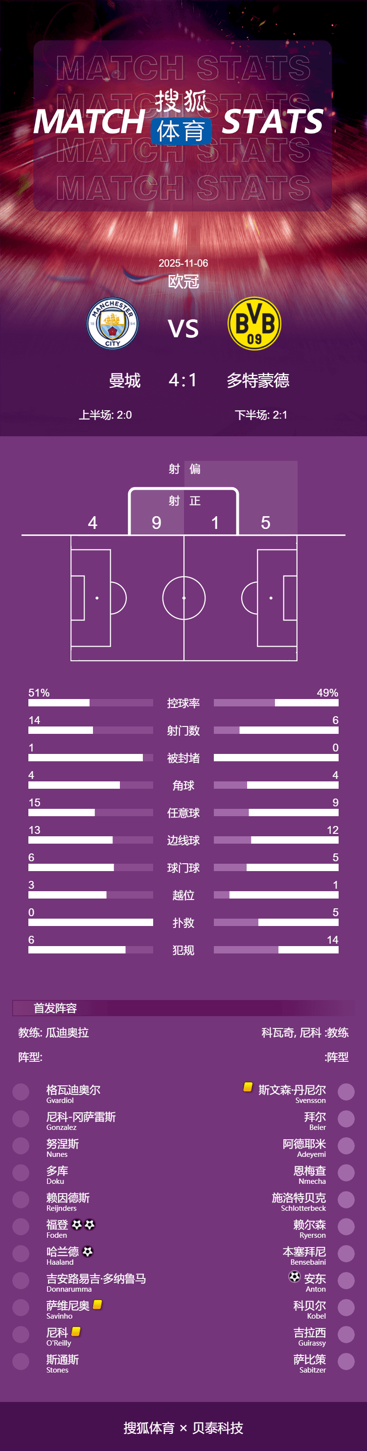 全场比赛结束,曼城主场4-1战胜多特蒙德,拿到各项赛事的3连胜。此外,在新赛季欧冠中3胜1平保持不败,仅次于4连胜的拜仁、阿森纳和国米。