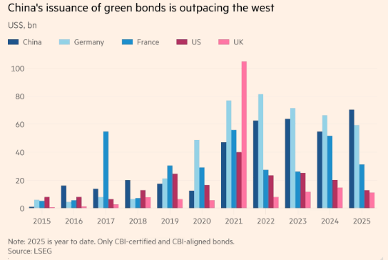 根据《金融时报》对伦敦证券交易所集团数据的分析计算,2025年中国经国际组织“气候债券倡议”认证或符合其标准的债券发行量达到创纪录的703亿美元(5050亿元人民币),首次超越欧美成为全球最大绿色债券市场。中国今年占据全球绿色债券发行总量的17%以上,而美国占比仅为3%。