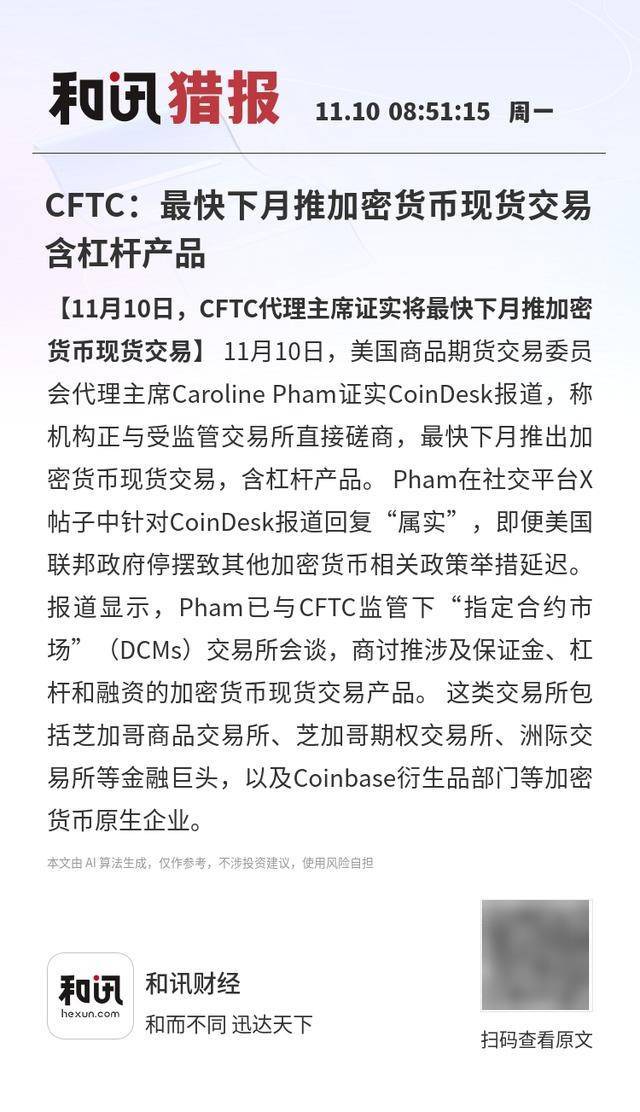 【11月10日,CFTC代理主席证实将最快下月推加密货币现货交易】11月10日,美国商品期货交易委员会代理主席Caroline Pham证实CoinDesk报道,称机构正与受监管交易所直接磋商,最快下月推出加密货币现货交易,含杠杆产品。Pham在社交平台X帖子中针对CoinDesk报道回复“属实”,即便美国联邦政府停摆致其他加密货币相关政策举措延迟。报道显示,Pham已与CFTC监管下“指定合约市场”(DCMs)交易所会谈,商讨推涉及保证金、杠杆和融资的加密货币现货交易产品。这类交易所包括芝加哥商品交易所、芝加哥期权交易所、洲际交易所等金融巨头,以及Coinbase衍生品部门等加密货币原生企业。