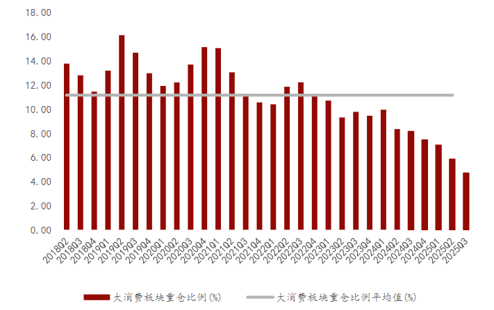 图:大消费板块重仓比例走势及其重仓比例平均值(%)