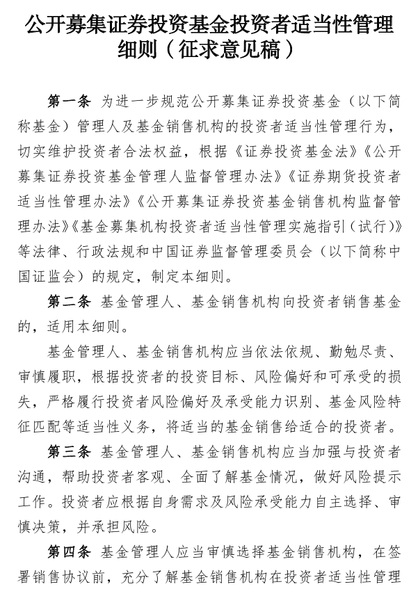 【大河财立方消息】11月12日,中基协就《公开募集证券投资基金投资者适当性管理细则(征求意见稿)》公开征求意见,进一步规范公募基金销售行为,保护投资者合法权益。