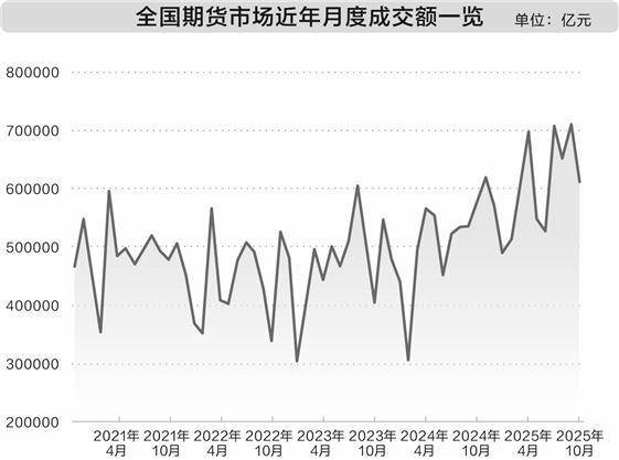 数据显示,以单边计算,10月全国期货市场成交量为6.03亿手、成交额为61.22万亿元,同比分别下降13.26%、增长4.54%。1~10月,全国期货市场累计成交量为73.47亿手、累计成交额为608.84万亿元,同比分别增长14.86%、21.82%。