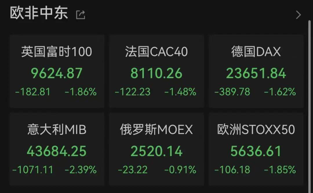 除黄金与白银,欧洲股市也全线大跌,截至发稿,英国富时100指数跌超1.8%,法国CAC40指数与德国DAX指数跌幅均超1.4%。