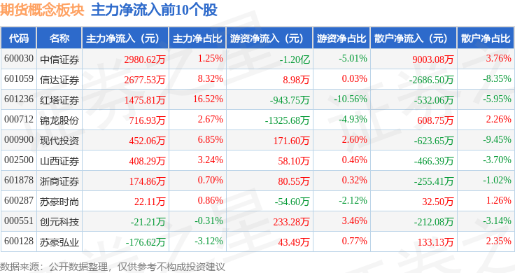 从资金流向上来看,当日期货概念板块主力资金净流出4.97亿元,游资资金净流出6119.68万元,散户资金净流入5.58亿元。期货概念板块个股资金流向见下表: