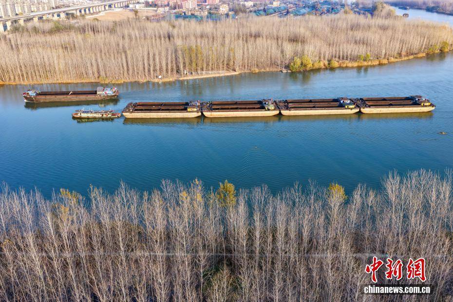 11月21日,航拍京杭运河宿迁龙运城段。作为贯通南北的“黄金水道”,京杭运河江苏段航运繁忙,流动的河水、行驶的船舶,在冬日静谧的景致中勾勒出一幅流动不息的壮美画卷。(无人机照片)中新社记者 泱波 摄