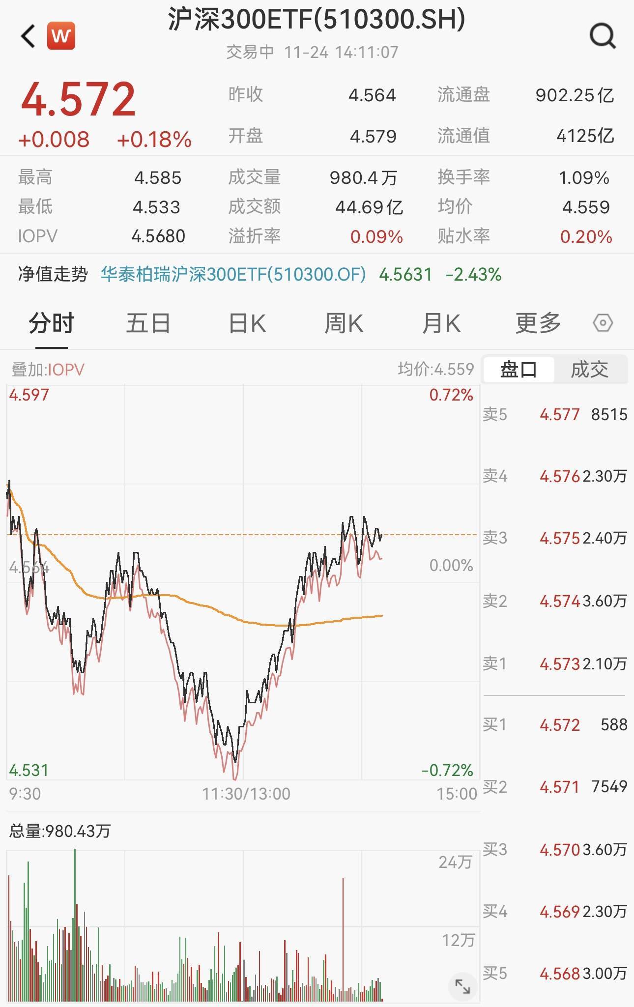 Wind数据显示,11月24日午后,多只龙头宽基ETF出现明显买盘,成交显著放量,包括沪深300ETF(510300)、沪深300ETF易方达(510310)、沪深300ETF(159919)、中证500ETF(510500)、中证1000ETF(512100)等。