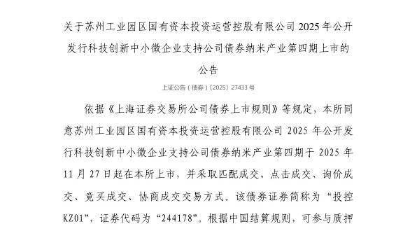 依据《上海证券交易所公司债券上市规则》等规定,上交所同意苏州工业园区国有资本投资运营控股有限公司2025年公开发行科技创新中小微企业支持公司债券纳米产业第四期于2025年11月27日起在上交所上市,并采取匹配成交、点击成交、询价成交、竞买成交、协商成交交易方式。该债券证券简称为“投控KZ01”,证券代码为“244178”。根据中国结算规则,可参与质押式回购。