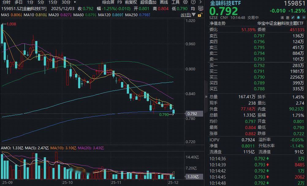 12月3日,金融科技板块继续下探寻底,个股普遍飘绿,仅税友股份、指南针、同花顺、艾融软件等4股上涨。热门ETF方面,同类规模最大的金融科技ETF(159851)场内下挫逾1%失守年线,“抄底资金”涌入,实时净申购超1亿份,此前两日资金已加仓超1.1亿元。