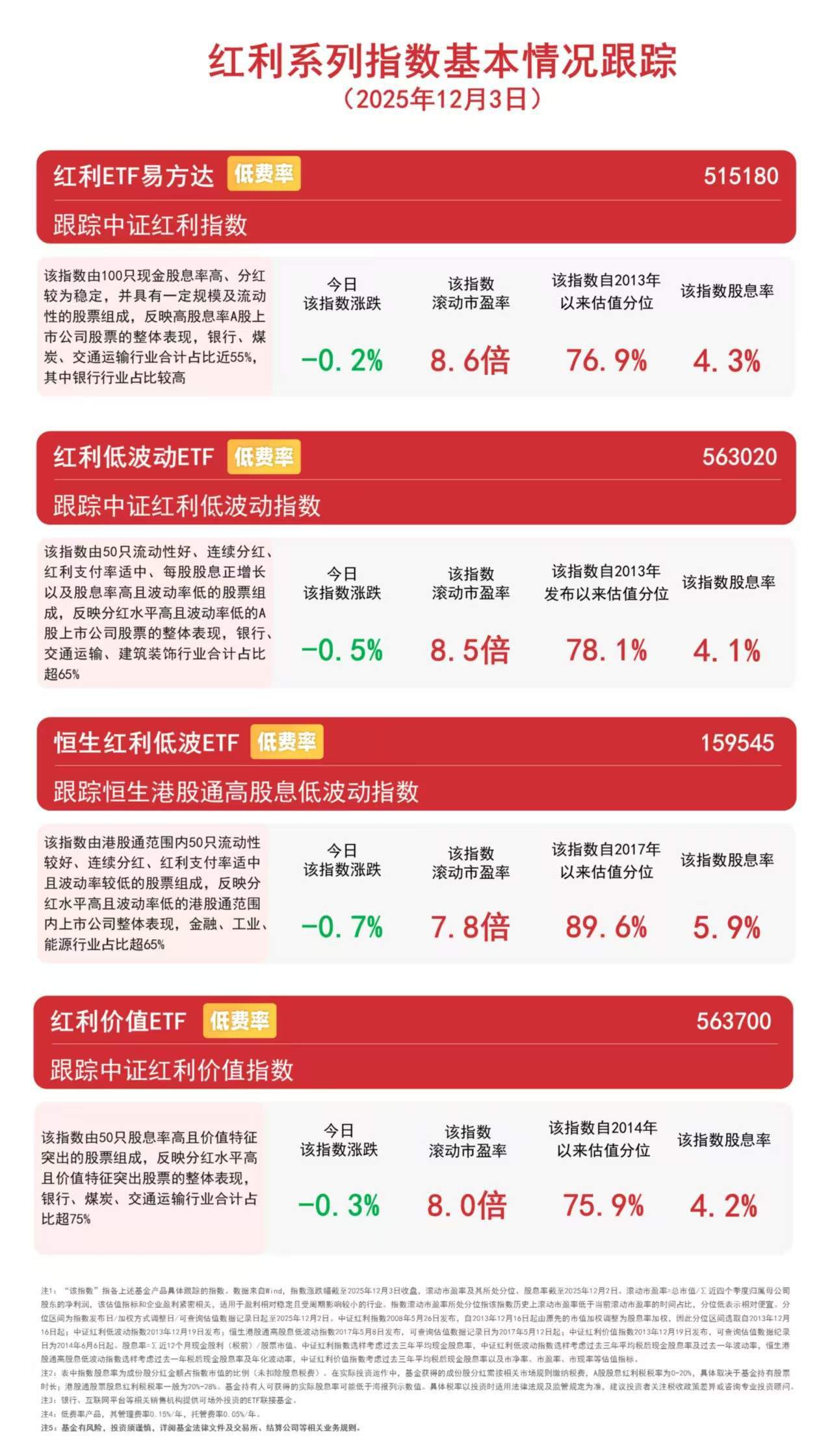 据悉,易方达基金是目前唯一一家红利类ETF全部实行低费率的基金公司,旗下恒生红利低波ETF(159545)、红利ETF易方达(515180)、红利低波动ETF(563020)、红利价值ETF(563700)、A500红利低波ETF(563510)等产品的管理费率均为0.15%/年,可助力投资者低成本布局高股息资产。