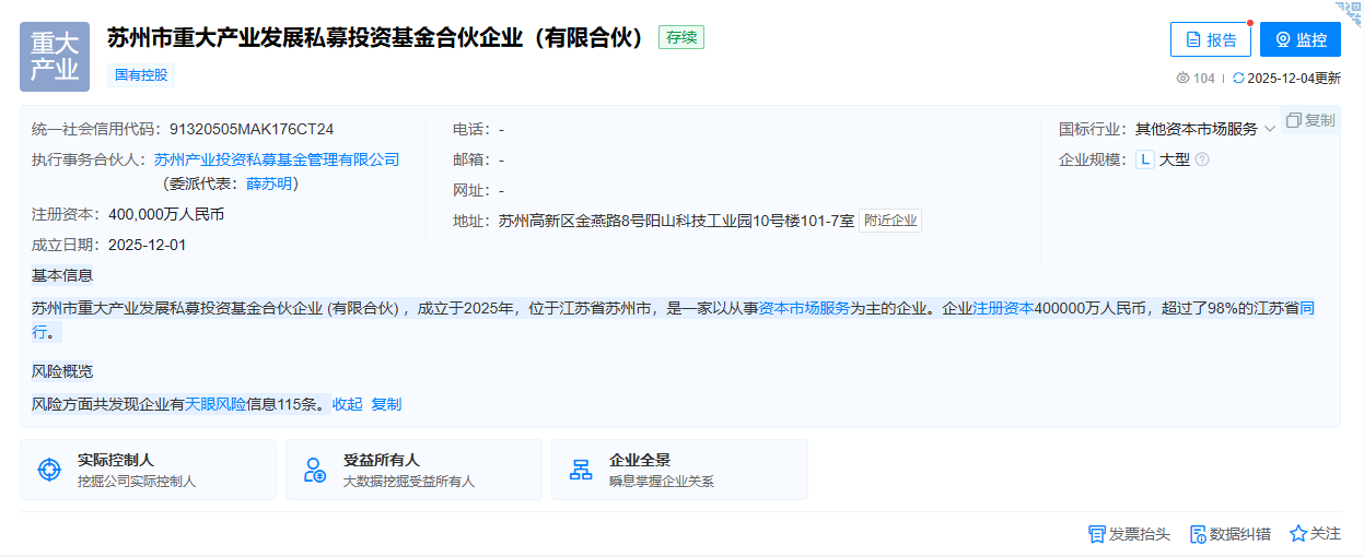 投资界12月8日消息,天眼查显示,近日,苏州市重大产业发展私募投资基金合伙企业(有限合伙)(下称“苏州市重大产业发展基金”)完成注册,注册资本为40亿,经营范围为以私募基金从事股权投资、投资管理、资产管理等活动;股权投资;创业投资;以自有资金从事投资活动。