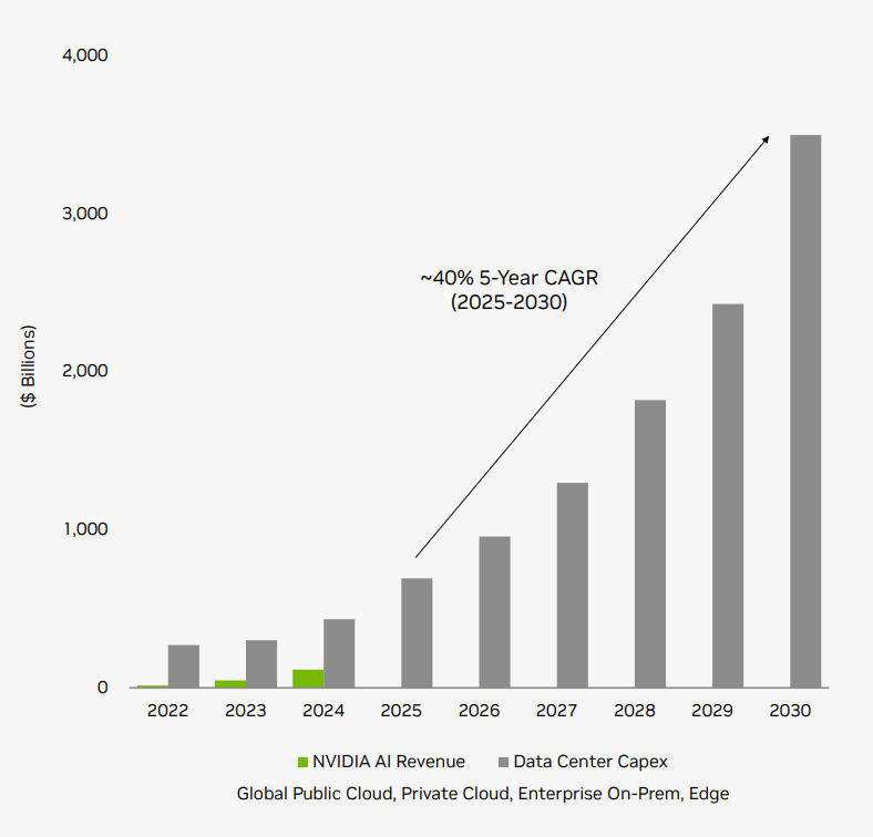 人工智能长坡厚雪,到2030 年人工智能基础设施支出将达到3万亿至4万亿美元。当前人工智能产业加速成长,但仍然具有广阔空间,后续5年仍有望按照40%左右的CAGR成长。