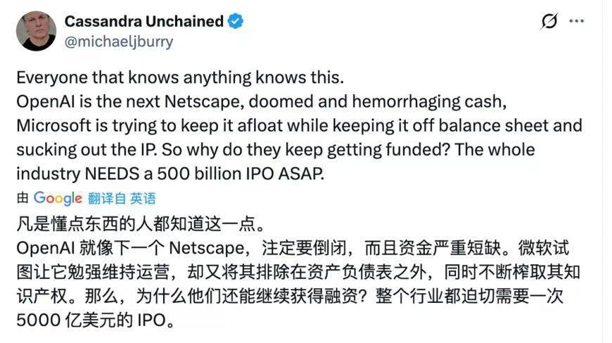 “OpenAI就是下一个网景,注定失败,它正在大量烧钱。”伯里在上周五晚些时候在X上回应Salesforce CEO马克·贝尼奥夫(Marc Benioff)的一条大语言模型帖子时写道。