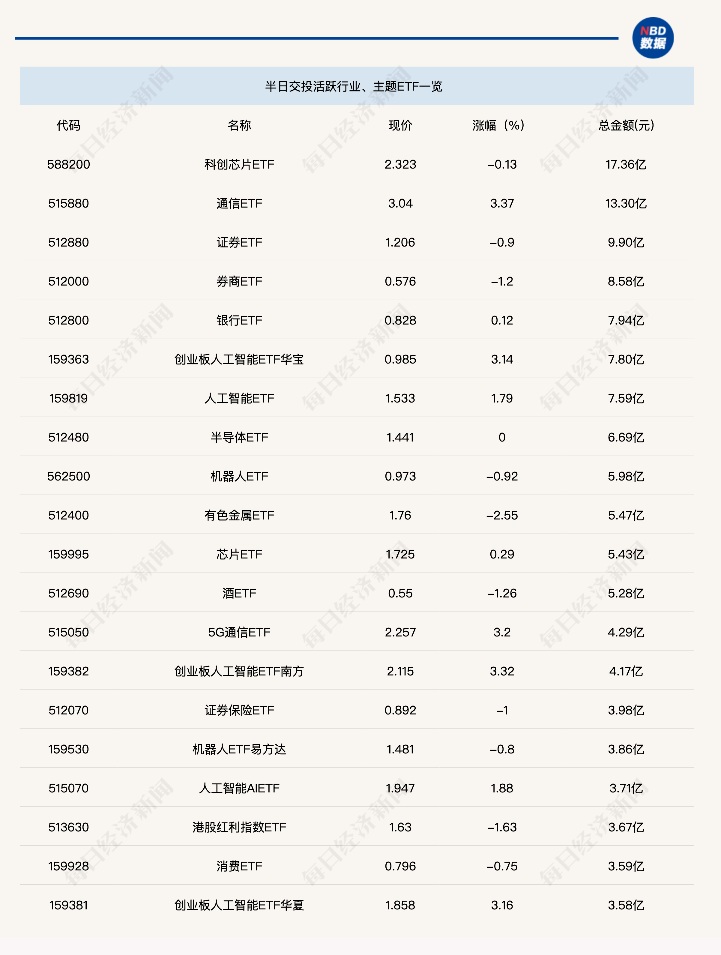 今日上午,通信和金融相关ETF交投相对活跃。其中,通信ETF(515880)半日成交金额达到13.3亿元,证券ETF(512880)、券商ETF(512000)以及银行ETF(512800)半日成交金额近10亿元。跨境ETF方面,香港证券ETF半日成交金额为37.58亿元,成交金额环比大幅萎缩。