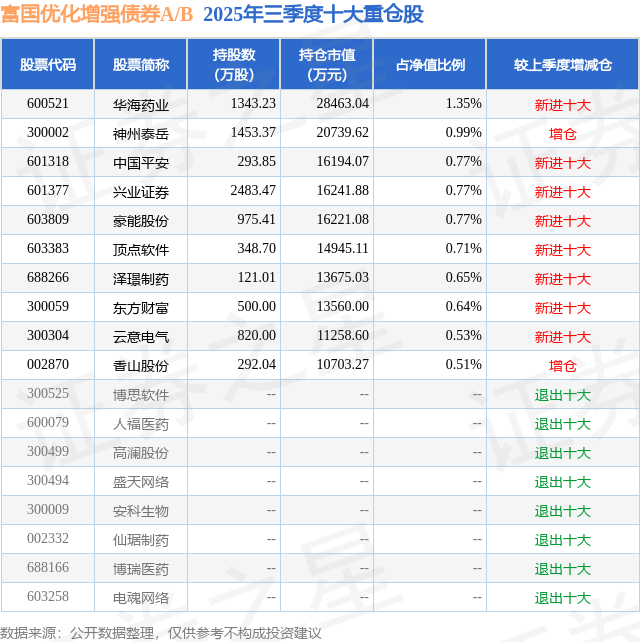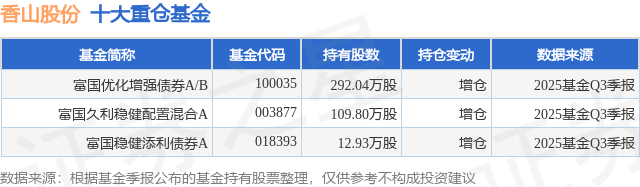 根据2025基金Q3季报公募基金重仓股数据,重仓该股的公募基金共3家,其中持有数量最多的公募基金为富国基金的富国优化增强债券A/B。富国优化增强债券A/B目前规模为49.41亿元,最新净值2.068(12月8日),较上一交易日上涨0.53%,近一年上涨16.64%。该公募基金现任基金经理为张育浩。张育浩在任的基金产品包括:富国悦享回报12个月持有期混合A,管理时间为2021年12月30日至今,期间收益率为15.79%;富国稳健双盈债券发起式A,管理时间为2022年12月21日至今,期间收益率为8.19%;富国双利增强债券A,管理时间为2025年2月26日至今,期间收益率为7.46%;富国稳健添利债券A,管理时间为2025年11月4日至今,期间收益率为-0.72%。