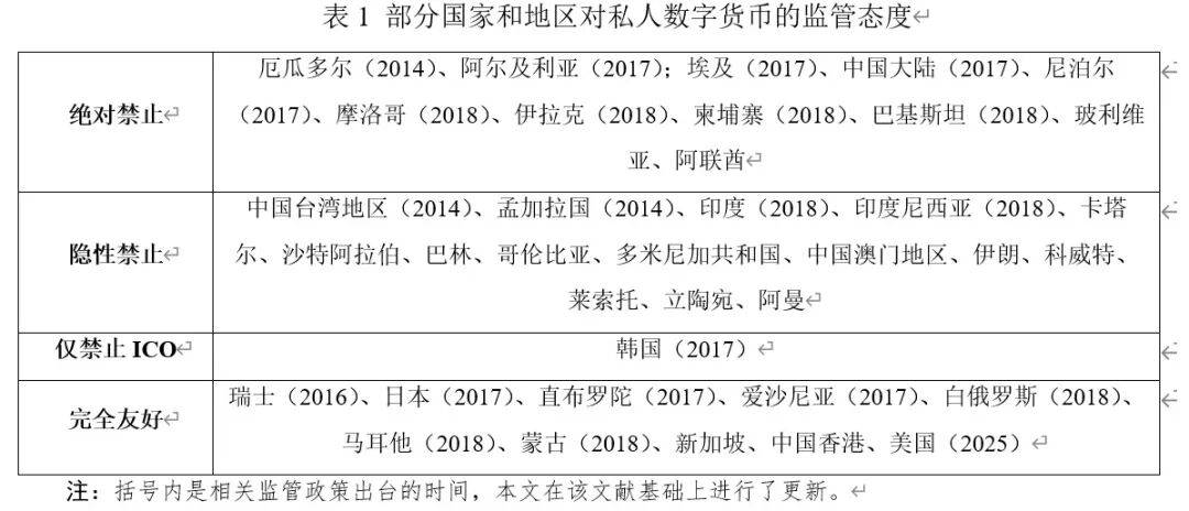 总体来看,不同国家根据各自的国情和对私人数字货币的认识提出了不同的监管举措。其中,多数采用谨慎偏积极的监管态度,将其交易纳入现有的监管框架,并配合制定相关监管法律法规。据袁磊(2019)统计,除去合法性未知的120个国家和地区,在全球131个国家和地区中,宣布比特币合法的有88个(占67.18%),且大都为发达国家和地区。而发展中国家则以禁止或限制为主,这可能与发展中国家常常实行资本控制政策和固定汇率制度有关。Borri & Shakhnov(2020)的研究从绝对禁止(Absolute Ban)、隐性禁止(Implicit Ban)、仅禁止ICO(ICOs ban)以及完全友好(“Crypto friendly”)这四个方面对部分经济体的监管态度或实践进行了统计,具体如表1所示。