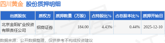 证券之星消息,四川黄金(001337)12月11日公开信息显示,股东北京金阳矿业投资有限责任公司向招商证券合计质押184.0万股,占总股本0.44%。质押详情见下表: