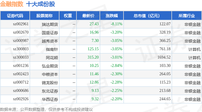 证券之星消息,12月11日,金融指数(399240)报收于1558.27点,跌1.51%,成交184.31亿元,换手率0.77%。当日该指数成份股中,上涨的有3家,张家港行以1.49%的涨幅领涨,下跌的有32家,瑞达期货以8.11%的跌幅领跌。