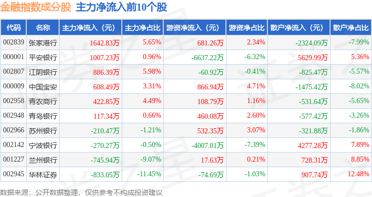 资金流向方面,金融指数(399240)成份股当日主力资金净流出合计21.24亿元,游资资金净流入合计4.69亿元,散户资金净流入合计16.55亿元。成份股资金流向详情见下表: