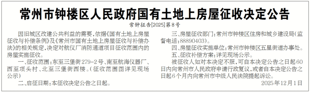 日前,钟楼区住建局在《常州日报》发布了一则房屋征收公告:因旧城区改建公共利益的需要,依据《国有土地上房屋征收与补偿条例》及《常州市国有土地上房屋征收与补偿办法》的相关规定,决定对航仪厂消防通道项目征收范围内的房屋实施征收。