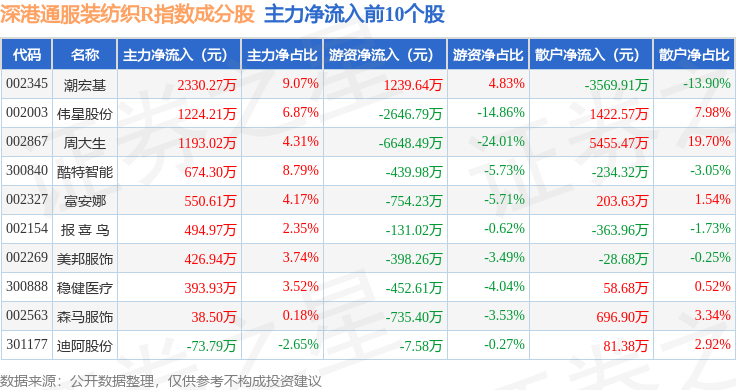资金流向方面,深港通服装纺织R(483041)指数成份股当日主力资金净流出合计3293.73万元,游资资金净流出合计4257.01万元,散户资金净流入合计7550.75万元。成份股资金流向详情见下表: