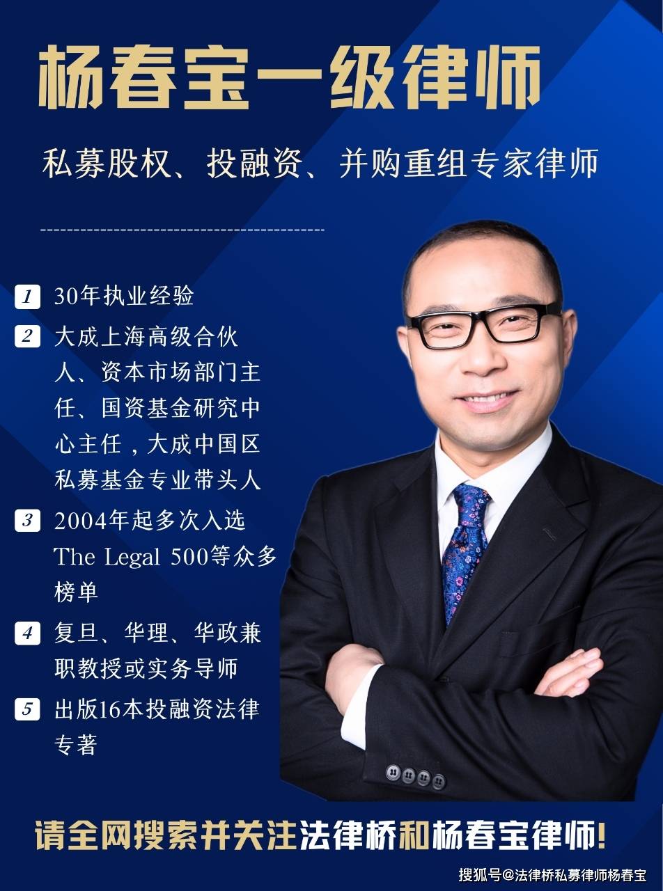 杨律师执业30年,长期从事私募基金、投融资、并购重组法律服务,涵盖大金融、大健康、房地产和基础设施、TMT、展览业、制造业等行业。2004年起多次入选The Legal 500“私募基金”和“公司与商业”榜单,并多次受到Asia Law Profiles特别推荐或点评,2016年起连续入选国际知名法律媒体China Business Law Journal“100位中国业务优秀律师”,荣获Leaders in Law - 2021 Global Awards“中国年度公司法专家”称号;连续荣登《中国知名企业法总推荐的优秀律师&律所》推荐名录。具有上市公司独立董事任职资格,系华东理工大学法学院兼职教授、复旦大学法学院实务导师、华东政法大学兼职研究生导师、上海交通大学私募总裁班讲师、上海市商务委跨国经营人才培训班讲师。出版《私募股权投资基金风险防控操作实务》《企业全程法律风险防控实务操作与案例评析》《完胜资本2:公司投融资模式流程完全操作指南》等16本专著。杨律师执业领域为:公司、投资并购和私募基金,资本市场,TMT,房地产和建筑工程,以及上述领域的争议解决。