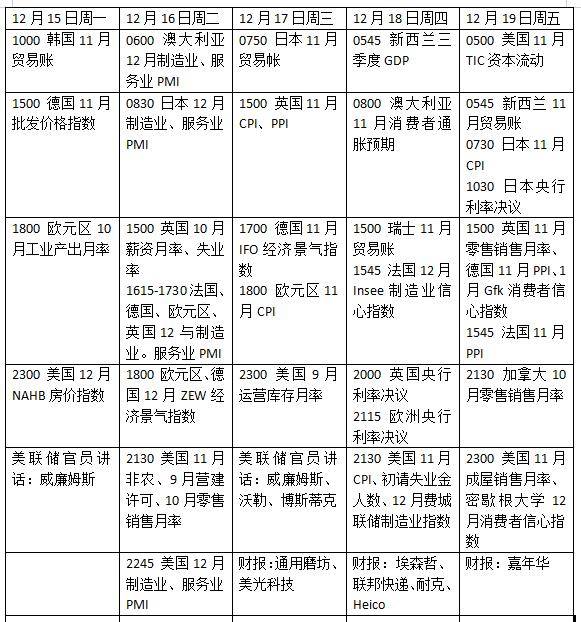 数据方面,16日发布的法国、德国及欧元区12月采购经理人指数(PMI)初值,将成为欧洲央行决策的重要参考依据。德国12月ZEW经济景气指数也将于当天公布,17日则会发布12月Ifo商业景气指数。19日,德国12月GfK消费者信心指数、意大利12月消费者及商业信心指数,以及欧元区10月国际收支数据将一同出炉。与此同时,18~19日召开的欧盟峰会也将受到市场关注。