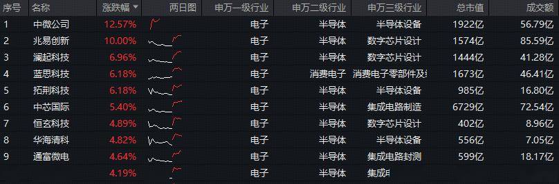 成分股方面,兆易创新涨停,中微公司领涨超12%,澜起科技、蓝思科技、拓荆科技涨逾6%。权重股方面,中芯国际涨超5%,立讯精密涨逾3%,工业富联、寒武纪涨超2%。