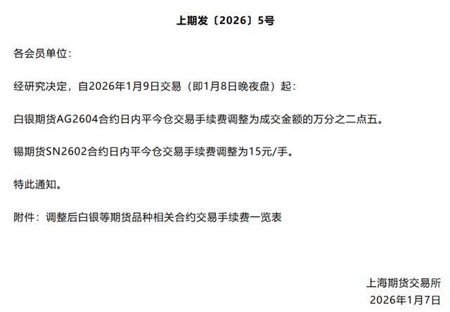 同时,上期所还宣布,同样从今天夜盘开始,白银期货AG2604合约日内平今仓交易手续费调整为成交金额的万分之二点五;锡期货SN2602合约日内平今仓交易手续费调整为15元/手。