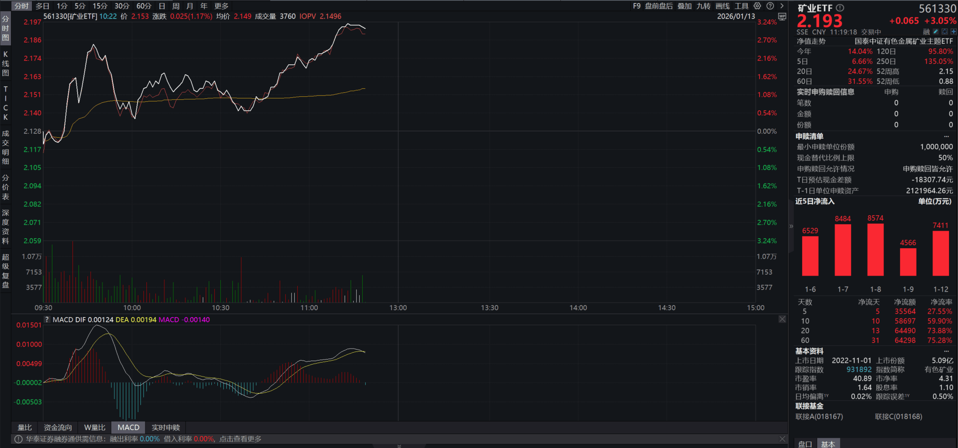 近期,COMEX黄金突破4600美元/盎司大关, “家里有矿,2025年涨超有色”的矿业ETF(561330)大涨超3%,资金持续布局,连续10日净流入近6亿元。