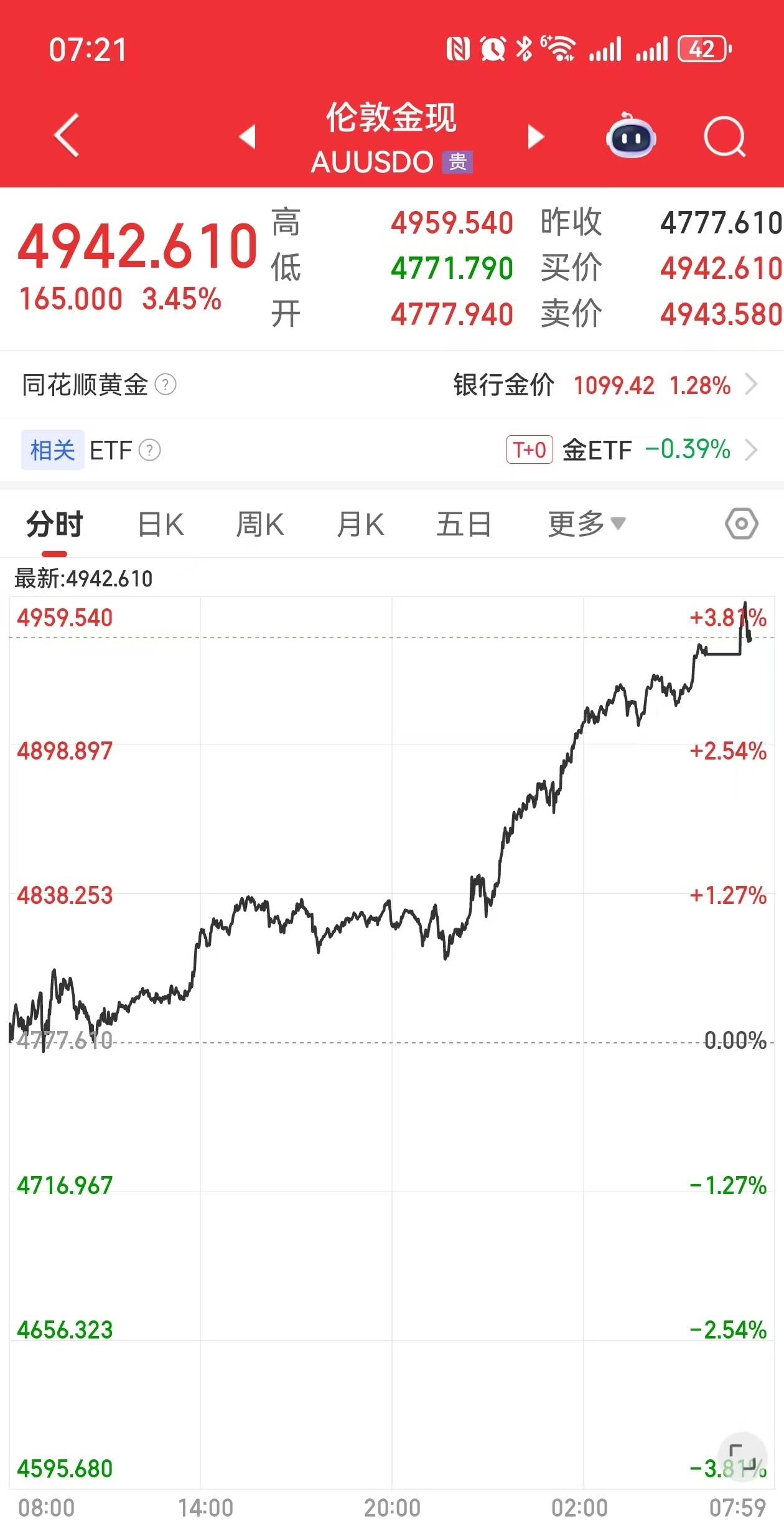 北京时间1月23日凌晨,国际金价历史首次突破4900美元/盎司。同花顺数据显示,截至北京时间1月23日上午7时21分,伦敦现货黄金盘中最高价为4959.53美元/盎司,最新价报4942.61美元/盎司,交易日内上涨3.45%。