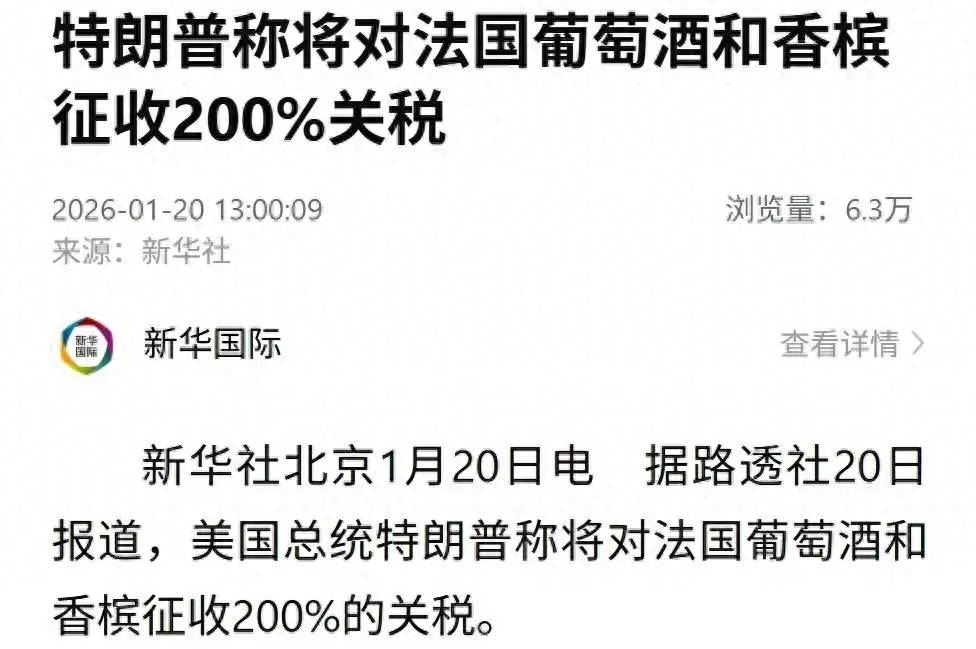 200%关税直接砸向法国葡萄酒和香槟,这是2026年1月20日特朗普向全球扔出的一颗重磅炸弹。当地时间1月19日深夜,特朗普表示要对法国葡萄酒和香槟征收200%的关税,以此迫使法国总统马克龙加入所谓的加沙"和平委员会"。