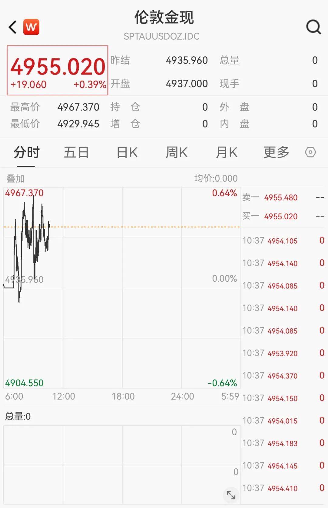 北京时间1月23日上午,伦敦现货黄金价格历史首次突破4960美元/盎司。Wind数据显示,截至发稿,伦敦现货黄金盘中最高价为4967.37美元/盎司,最新价报4955.02美元/盎司,交易日内涨0.39%。