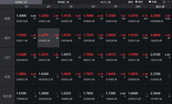 银行间主要利率债收益率全线下行,截至下午16:30,10年期国债活跃券250016收益率下行0.15bp报1.831%,30年期国债活跃券2500006收益率下行1bp报2.25%,10年期国开活跃券250215收益率下行1.85bp报1.9125%。