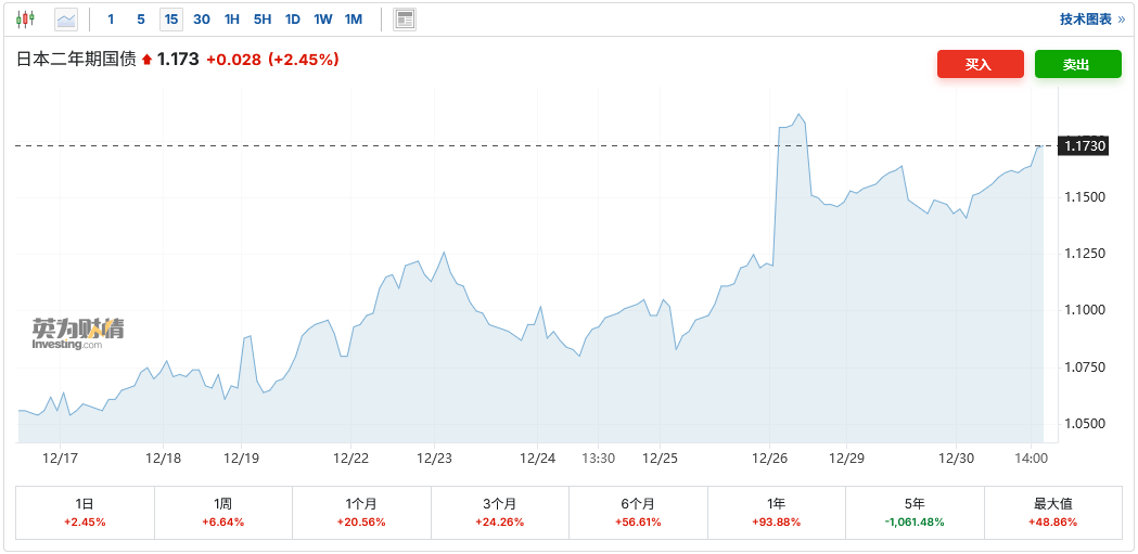 在此背景下,日本短期国债收益率也面临上行压力。截至发稿,对货币政策敏感的两年期日本国债收益率周二上升3个基点,至1.173%;该收益率过去一个月以来已上涨逾20%。