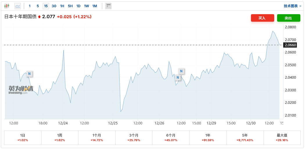 智通财经APP获悉,由于对日本政府财政状况的担忧,基准十年期日本国债收益率周二上升逾2个基点,至2.077%,距离12月22日触及的2.1%水平不远,该水平是自1999年2月以来的最高水平。数据显示,该收益率在2025年已累计飙升近1个百分点,创下自1994年以来的最大年度涨幅。