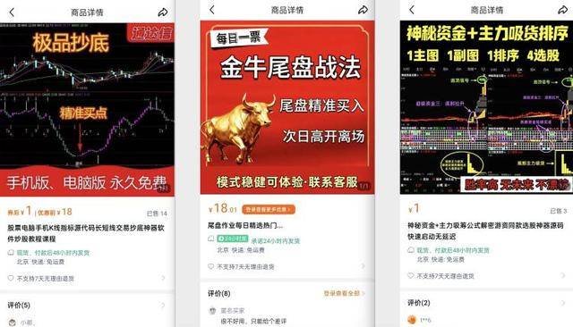 记者在闲鱼以相关关键词搜索,发现大量售价低廉的所谓“炒股神器”和“抄底教程”。例如,一款名为“极品抄底”的股票指标软件,售价仅1元,宣称能提供“精准买点”;另一款“神秘资金+主力吸货排序”公式商品,标榜为“游资同款选股神器”;还有“尾盘战法”商品,承诺“尾盘精准买入,次日高开离场”。