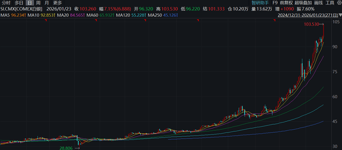 北京时间1月24日凌晨,白银价格继续高歌猛进,COMEX白银、现货白银先后历史性突破100美元/盎司大关,并站上103美元关口,年内累计涨幅已超40%,同期表现远超黄金。