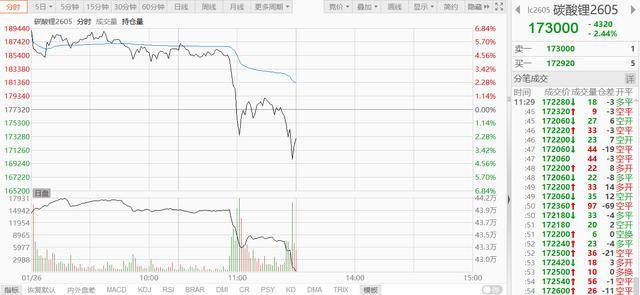 1月26日上午,碳酸锂期货主力合约碳酸锂2605盘中两度下杀,价格由涨转跌,截至中午收盘,碳酸锂2605下跌2.44%,报173000元/吨。