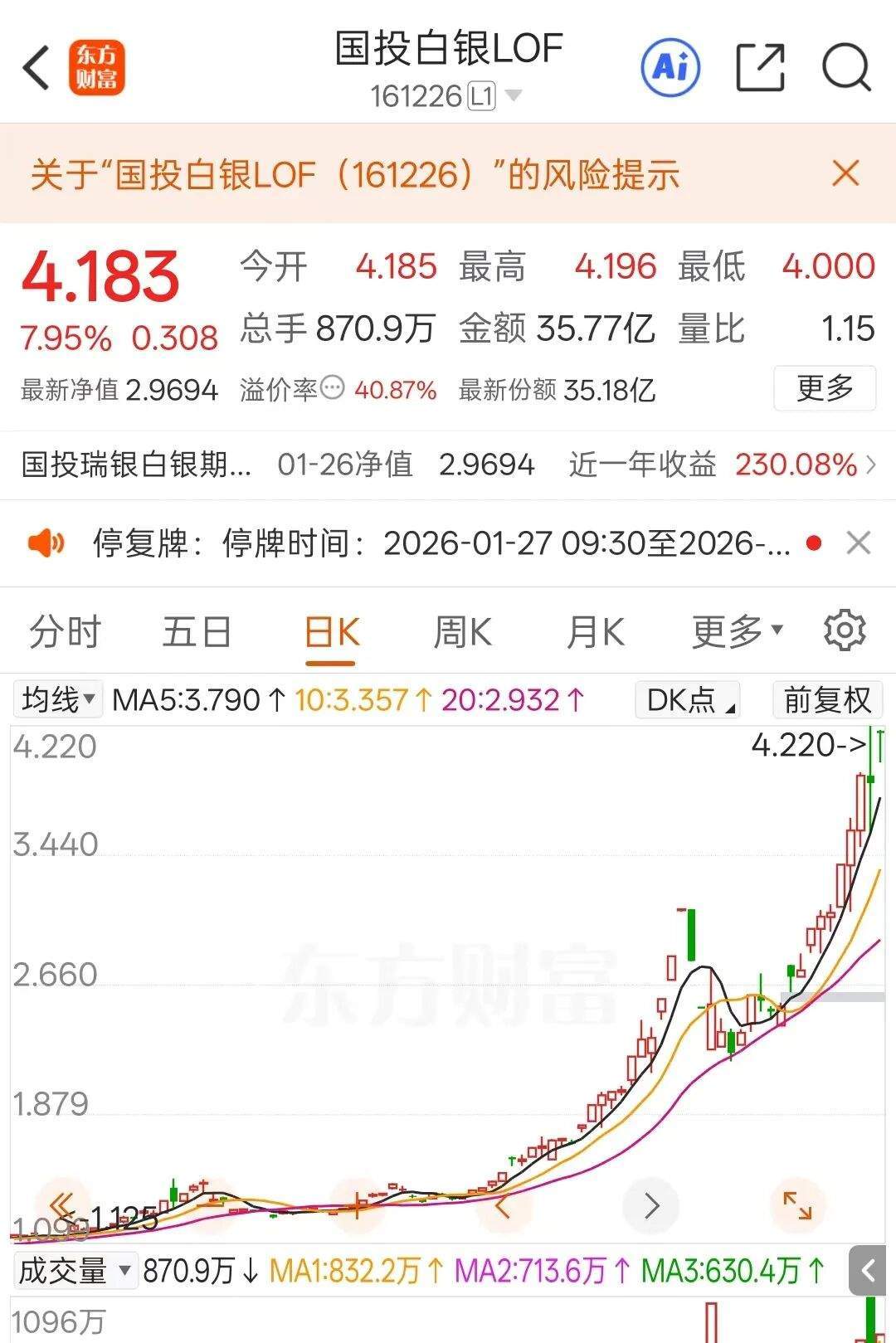 1月26日晚,国投白银LOF(161226)公告,将于2026年1月28日起暂停申购(含定期定额投资)业务。此外,该基金还公告,将于1月27日开市起至当日10:30停牌。
