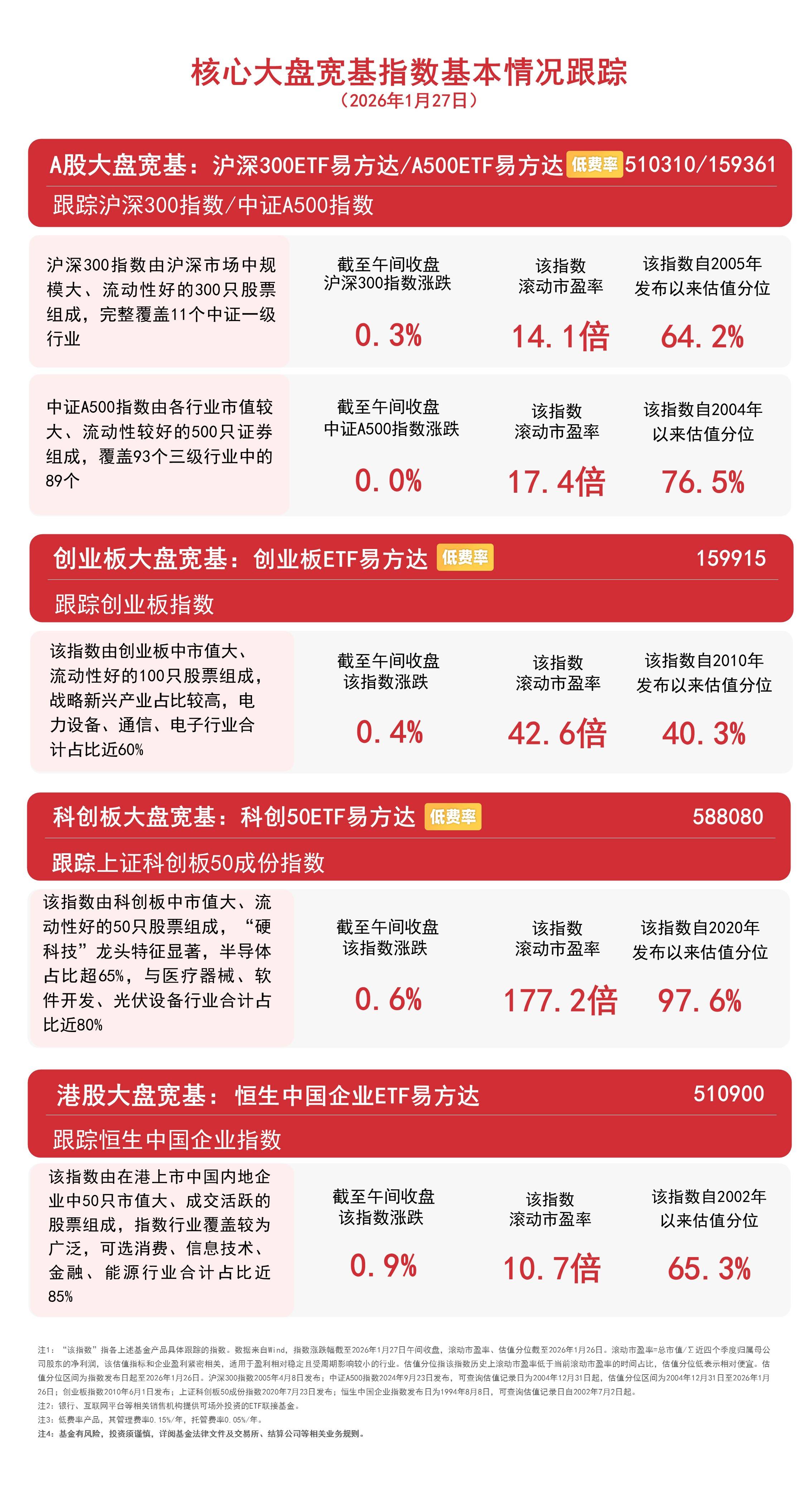 1月27日早盘,A股三大指数涨跌不一,沪指半日涨0.03%,全市场成交额约1.9万亿元。板块题材上,黄金、有色金属、石油天然气、能源设备板块涨幅居前,餐饮旅游、航空、白酒等板块跌幅居前;港股走强,大金融板块集体走强,钢铁、建筑板块跌幅居前。截至午间收盘,中证A500指数上涨0.01%,沪深300指数上涨0.3%,创业板指数上涨0.4%,上证科创板50成份指数上涨0.6%,恒生中国企业指数上涨0.9%。