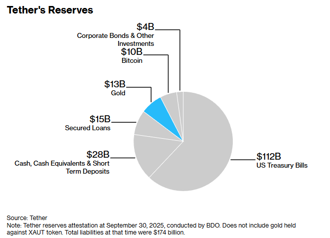 目前,Tether的盈利主要来自其美元稳定币USDT——目前流通规模高达1860亿美元。该公司以USDT换取真实美元,并将这些资金投资于美国国债及黄金等资产,从中获得数十亿美元的利息和交易收益。