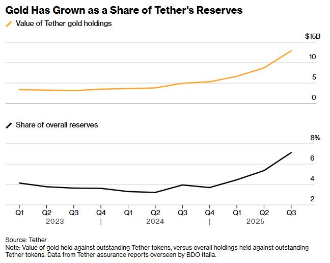 黄金在Tether储备中的占比持续上升